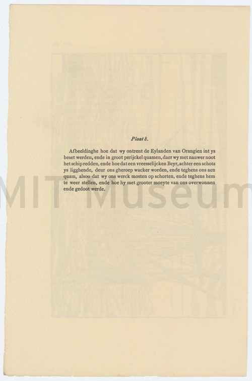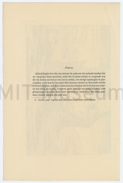 Plaat 9 Woodcut of a ship being pushed through a narrow channel of water …