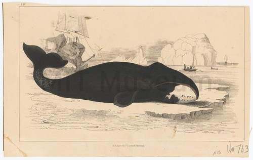 Plate LIV Colored engraving of a large whale with a white patch on its …