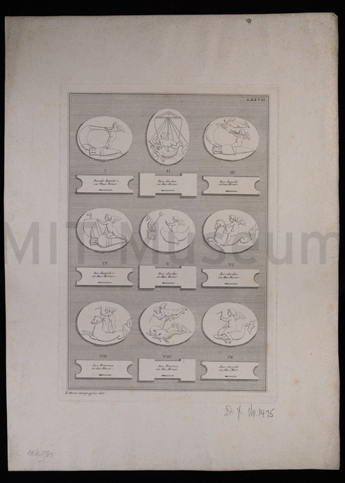 Plate LXXVII Print depicting nine Roman seals or emblems on a striped ground, with …