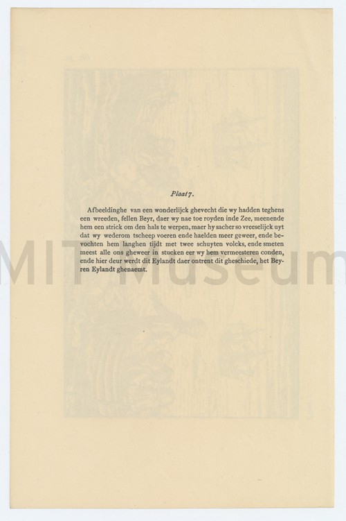 Plaat 7 Black and white woodcut from a book depicting a seal hunt. There …