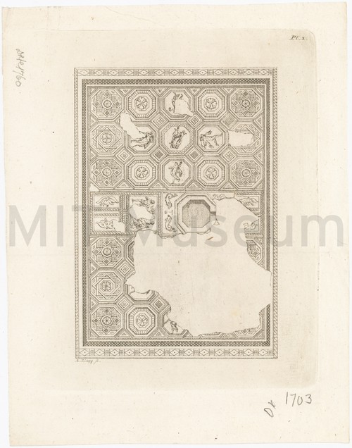 Pl. I: Mosaic Monochrome engraving depicting a mosaic with geometric motifs and various human figures, …