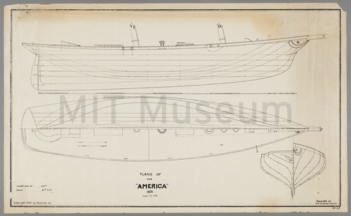 Plans of the America 1851 No. 27 white print of sheer, half-breadth, and body views with deck …