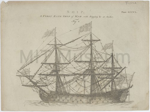 Plate CCCL. Ship. A First Rate Ship of War with Rigging &c … Diagram of a British, first rate ship of war with rigging and …