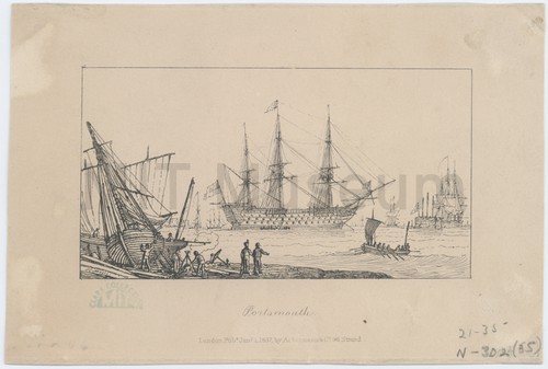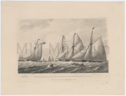 Portsmouth Regatta. Augt. 14, 1827. the Therese belonging to the Earl of … Depiction of the finish line of the Portsmouth Regatta, with the Therese …