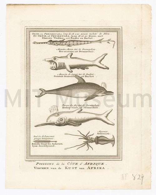 Poissons de la Cote d'Afrique/Vischen van de Kust van Afrika Engraving of sharks, porpoises, and squid from the coast of Africa. Descriptions …
