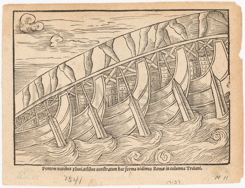 Pontem navibus Fluviatilibus constratum hac forma vidimus Romae in columna Traiani. Woodcut from the book "De Re Navale" with a representation of a …