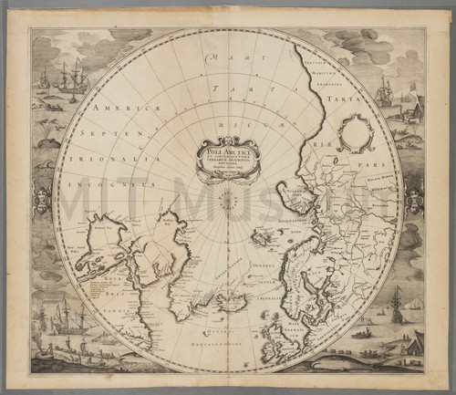 Poli Arctici, et circumiacentium terrarum descriptio novissima / sumptibus Henrici Hondij. Uncolored of a map of the arctic surrounded by scenes of whaling …