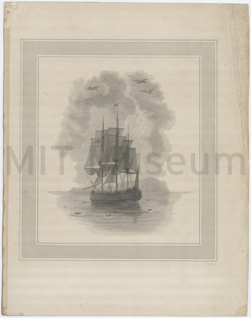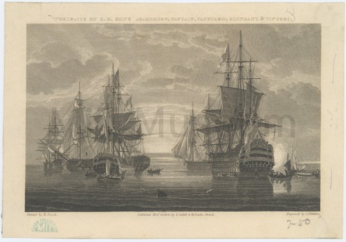 Portraits of H.M. Ships Agamemnon, Captain, Vanguard, Elephant, & Victory. Scene of five ships on the water at sunrise or sunset; three …
