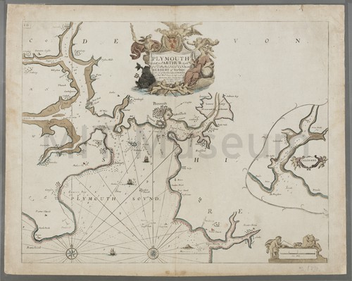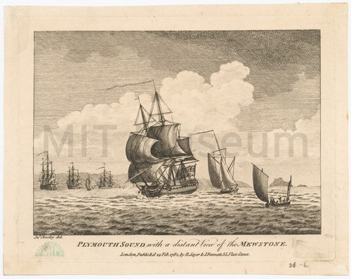 Plymouth Sound with a distant View of the Mewstone. Seascape with four large ships and several single-masted boats. The closest boat, …