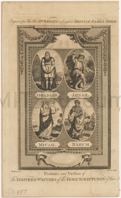 Portraits and Dresses of the Inspired Writers of the Holy Scriptures Monochrome engraving with portraits of Obadiah, Jonah (with spouting whale in background), …