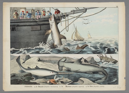 Poissons a) Le Requin (Squalus charcharias). b) Le Marteau (Squalus zygaena) c) … Colored print depicting two scenes of sharks, stacked vertically;the print is made …