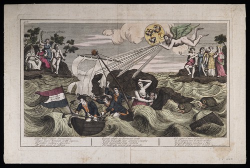 Politicians in boat with sail labelled "Fanatismo" Hand-colored engraving depicting a sea scene with three men and a deshabille …