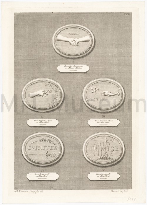 Plate showing five medals Uncolored engraving showing five medals, with accompanying captions describing the material of …