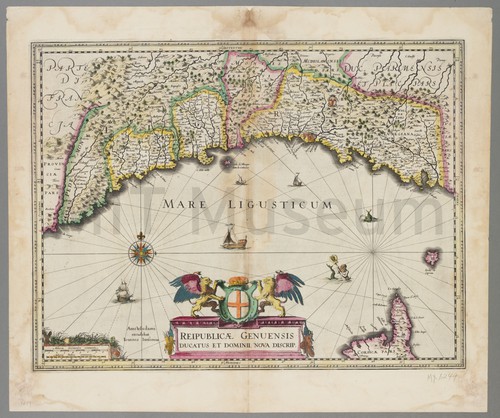 Reipublicae Genuensis Ducatus et Dominii Nova Discrip. Brightly hand-colored map of Genoa, Italy. Taken from the French edition of …
