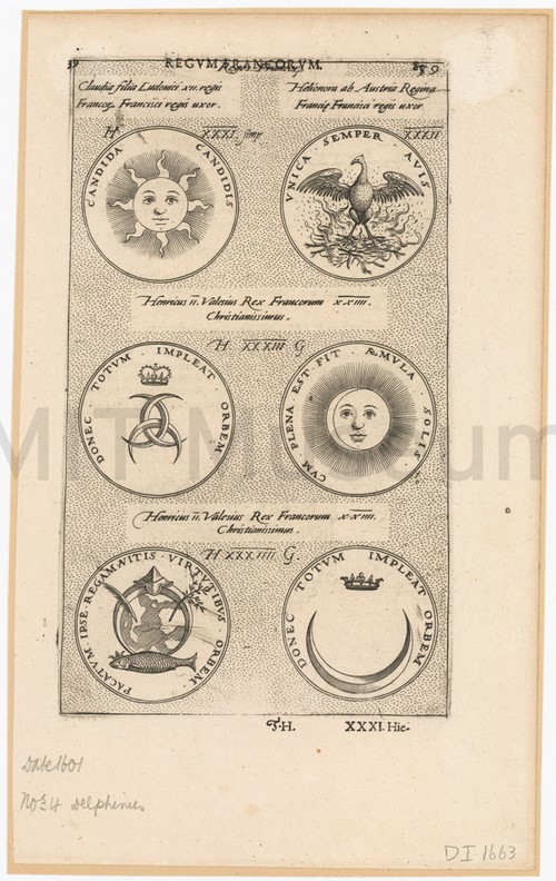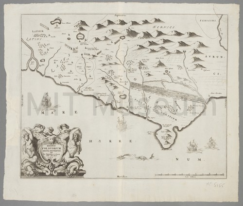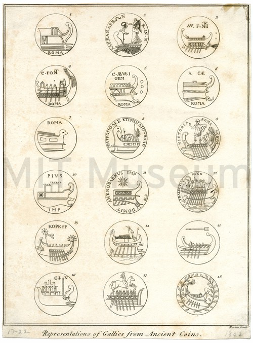 Representations of Gallies from Ancient Coins. Engraving depicting 18 coin faces, in three columns, each depicting a stylized …