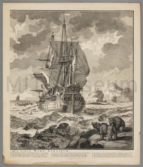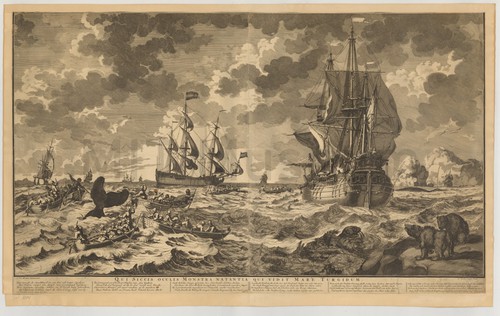 Qui Siccis Oculis Monstra Natantia Qui Vidit Mare Turgidum Large engraving depicting several Dutch ships and many whaling boats attacking whales. …