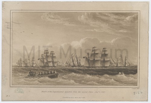 Return of the Experimental Squadron from the 2nd cruise. View of the Experimental Squadron of large three-masted vessels returning to harbor. …