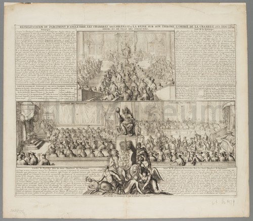 Representation du Parlement d'Angleterre, les chambres assembl̩es et de la reine sur … Double-page, copperplate engraved plate from an 1700s edition of Atlas Historique, published …