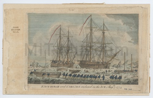 Racehorse and Carcass enclosed in the ice, August 7, 1773 Colored depiction of the HMS Race-Horse and HMS-Carcass enclosed in the ice …