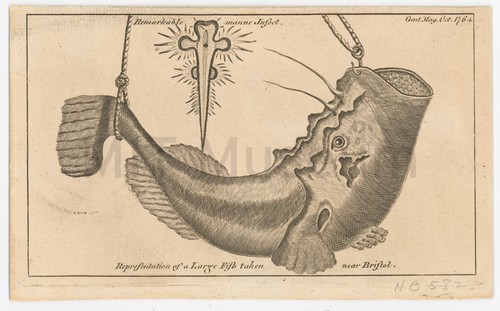 Representation of a Large Fish Taken near Bristol Image of a fish with jagged protrusions and two long thorn-like projections …