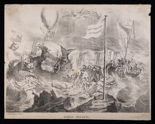 Roman Regatta Uncolored political lithograph depicting boats on a stormy sea with passengers giving …