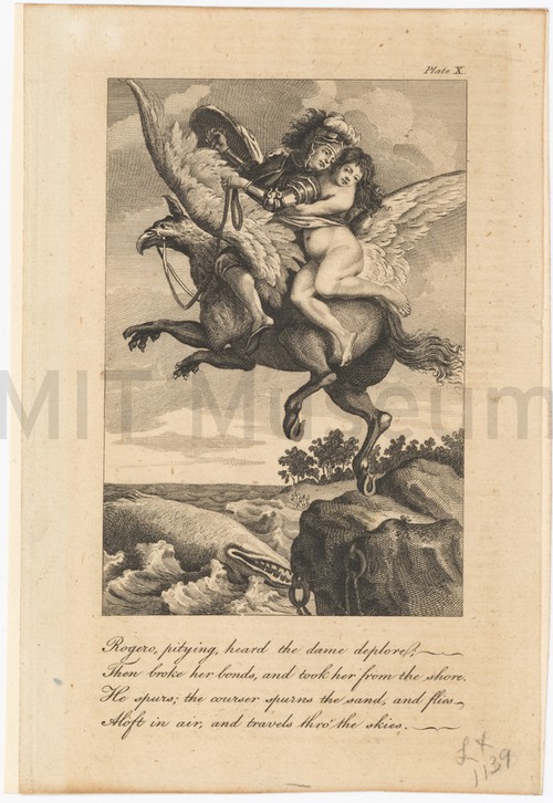 Rogero with Angelica on his hippogriff Monochrome engraving from a copy of "Orlando Furioso", depicting the knight Rogero …