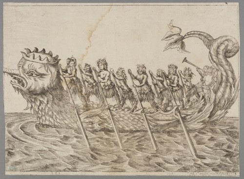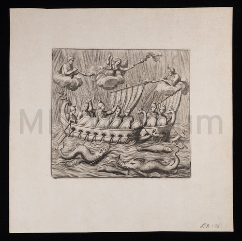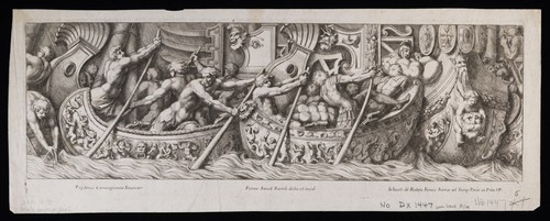 Rowing Race (whale carved on boats) Uncolored engraving depicting a scene at sea with several Roman galleys, which …