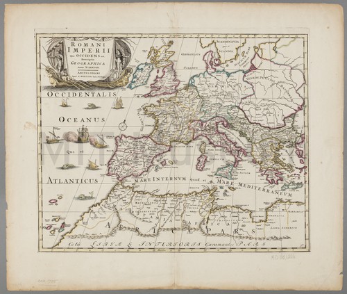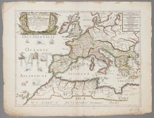 Romani Imperii qua occidens est descriptio geographica A hand-colored map of classical Europe and North Africa. The title cartouche …