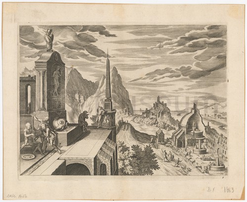 Rocky riverscape, on the left three boys and a Moor Uncolored engraving depicting a mountainous riverside area as seen from the balcony …