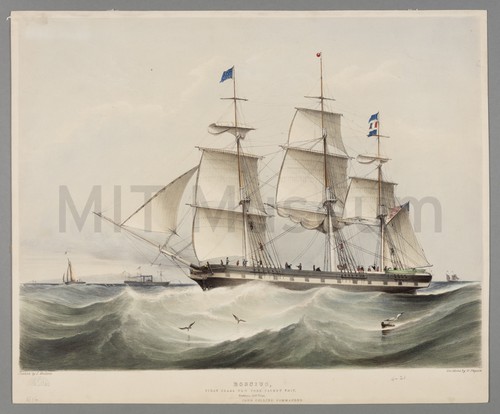 Roscius, first class New York packet ship, burthen 1100 tons, John Collins, … Portrait of the packet ship Roscius. She has three masts and flies …