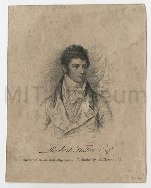 Robt. Fulton's Steam Boat, the North River or Cleremont, 1807. Side view ship portrait of Fulton's steam-and-sail vessel "Northriver" or "Cleremont". Title …