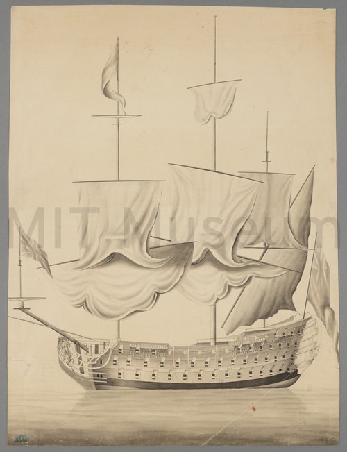 Royal Charles - Stern View, built in 1673 Engraving depicting a stern view of a large ship, identified in a …