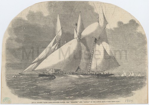 Royal Thames Yacht Club Schooner Match, June 5, 1869. Black and white lithograph depicting a schooner match by the Royal Thames …