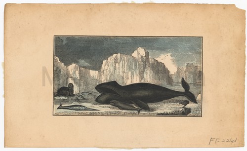 Small colored engraving of whales on icecaps Colored engraving depicting a baleen whale, its young, and a narwhal beached …