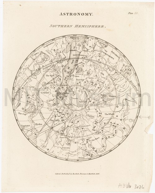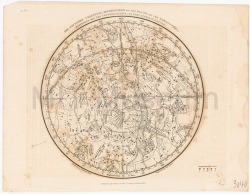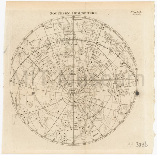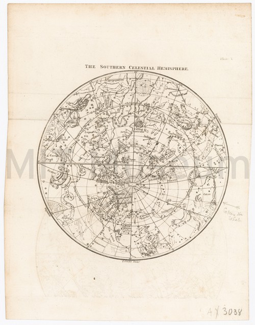 Southern Celestial Hemisphere Monochrome engraving depicting a star chart of the southern hemisphere. A pencilled …