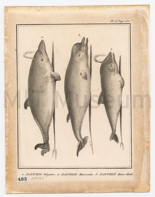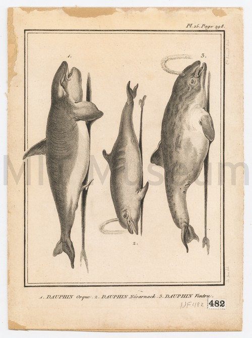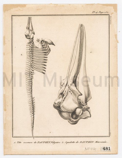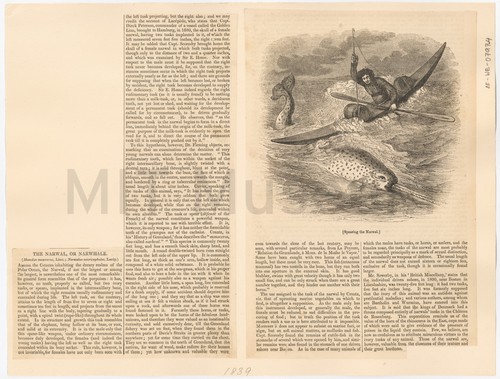 Spearing the Narwhal (and with other parts of whales) (1090) Book page with hand colored illustrations of cetaceans. Includes a porpoise skeleton, …