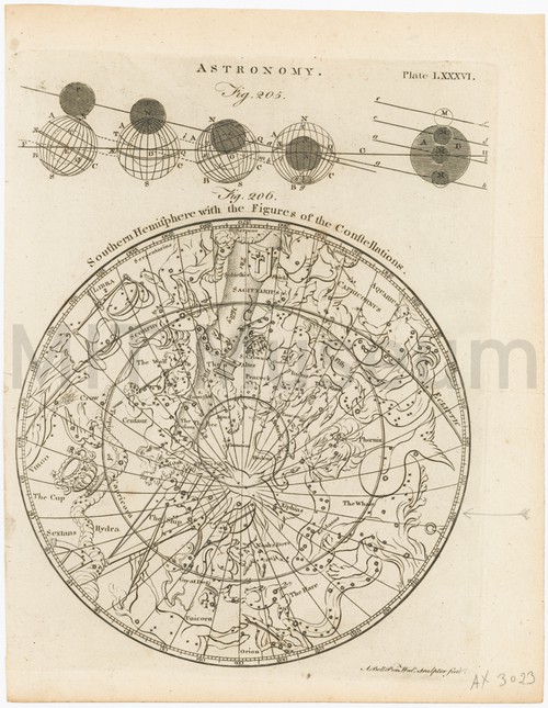 Southern Celestial Hemisphere, etc... Monochrome engraving depicting a star chart for the southern hemisphere. Cetus, the …