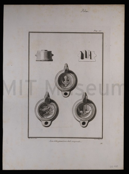 Sono della grandezza dell' orignale. Engraving depicting three Italian lamps and two cross sections of a lamp. …