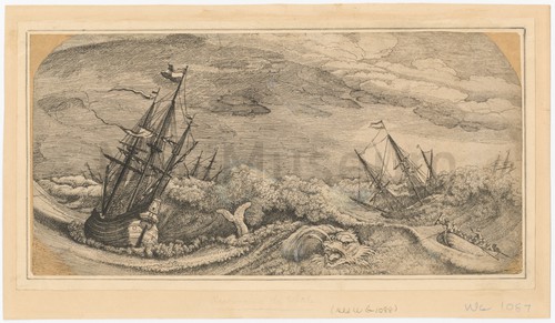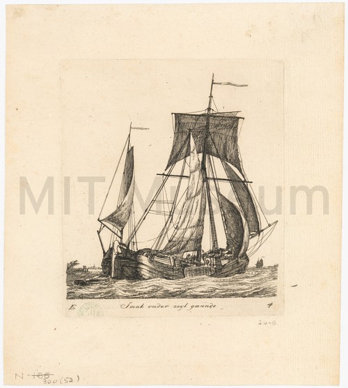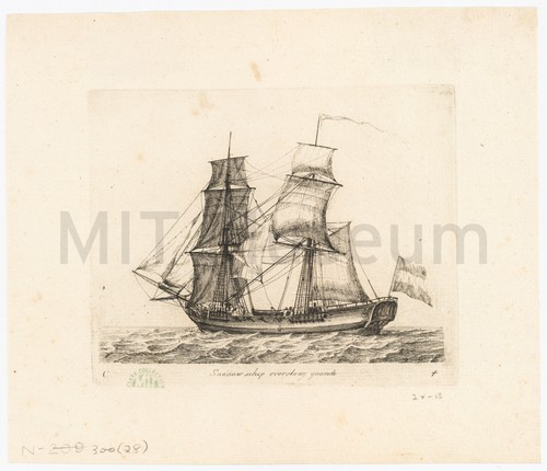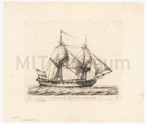 Snaauw schip Zeylende voor de wind. Etching depicting a side view of a two-masted snarl, her sails full …
