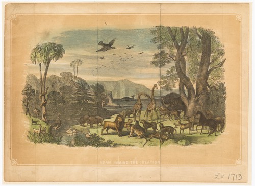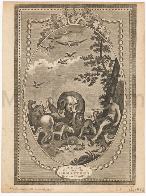 Adam naming the Creatures - Genesis Chap. II ver. 19 Monochrome engraving of Adam, at right, pointing at various animals, including an …