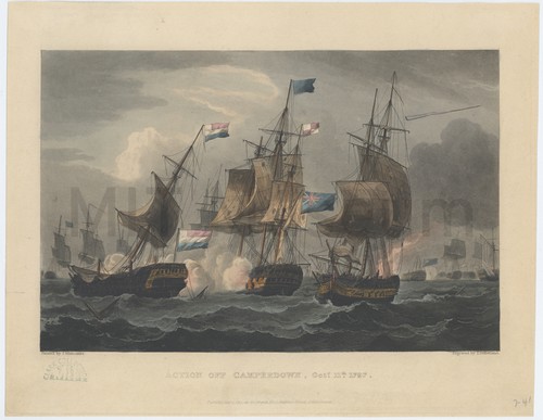 Action off Camperdown, Oct. 11th 1797. Hand-colored etching depicting naval action off of Camperdown, with three ships in …