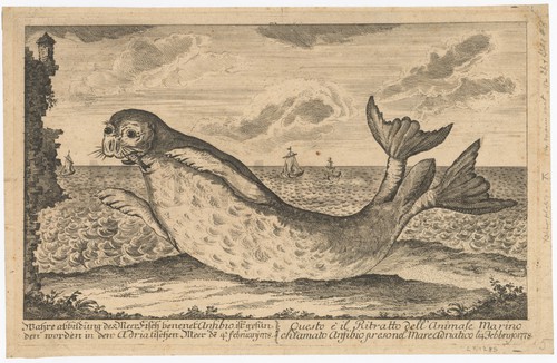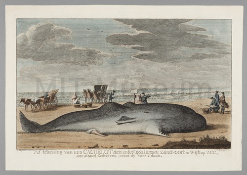 Af tekening van een Cachelot den 20 Feb. 1762 tussen Zandvoort en … Hand-colored engraving depicting a beached male cachelot, side view, surrounded by spectators. …