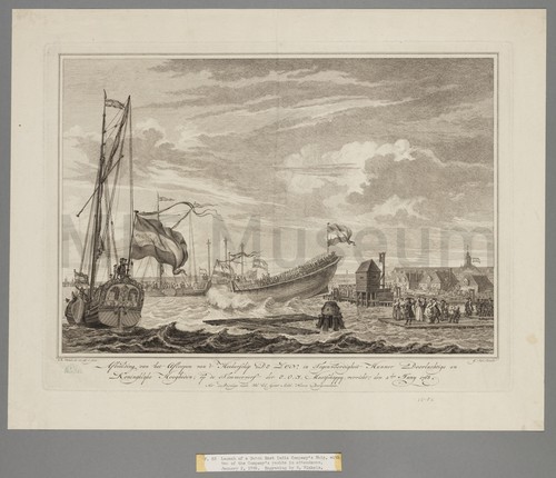 Afbeelding van het Afloopen van 't Hoekerschip De Zon A scene of the launching of the VOC ship 'De Zon' (1599) …