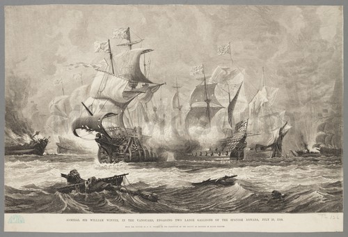 Admiral Sir William Winter, in the Vanguard, engaging two large galleons of … From the Extra Supplement to The Illustrated London News published July 31, …