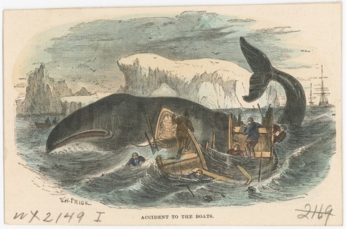 Accident to the boats Colored engraving depicting a shattered rowboat, with six men clinging to it …