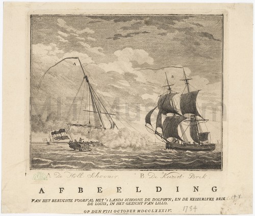 Afbeelding van het Beruchte Voorval Met's Lands Schoone de Dolphyn, en de … Engraving depicting a naval battle between two small ships: at left, a …