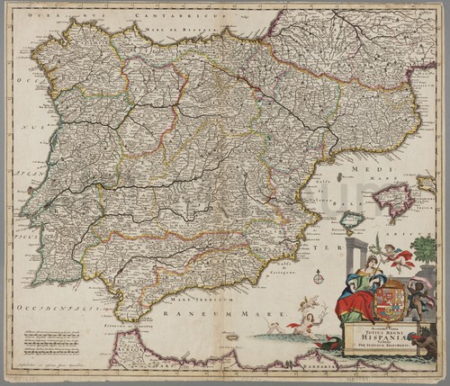 Accuratissima Totius Regni Hispaniae Tabula Hand-colored, detailed map of the Iberian Peninsula by Justus Danckerts (1635-1701). Includes …