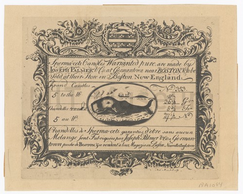Advertisement of "Spermaceti Candles..." Monochrome photograph of an advertisement, probably 18th century, for spermaceti candles made …