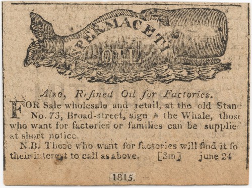Advertisement for Spermaceti Oil Monochrome newspaper clipping with advertisement for spermaceti oil. Header is a woodcut …