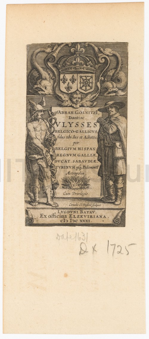 Abrah Golnitzl. Dantisc Ulysses Belgico-Gallicus Monochrome title page from a book (duodecimo) with elaborate decorations. Text reads, …